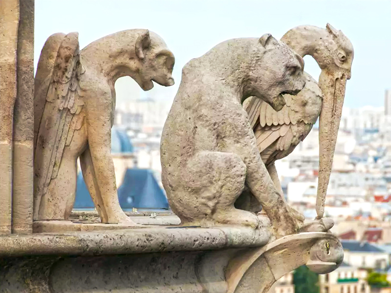 Contrairement aux chimères, les gargouilles médiévales de Notre-Dame sont authentiques et ont une fonction précise : elles servent de dégorgeoirs, c’est-à-dire de canalisations d’eau de pluie. Ces figures en pierre qui émergent des murs de la cathédrale à hauteur des toitures sont creuses : l’eau de pluie s’écoule à travers leur corps et est rejetée loin des fondations par leur gueule ouverte. Sans les gargouilles, l’eau ruissellerait le long des murs et éroderait les fondations en quelques décennies. La gargouille, c’est avant tout une technique de génie civil déguisée en monstre.