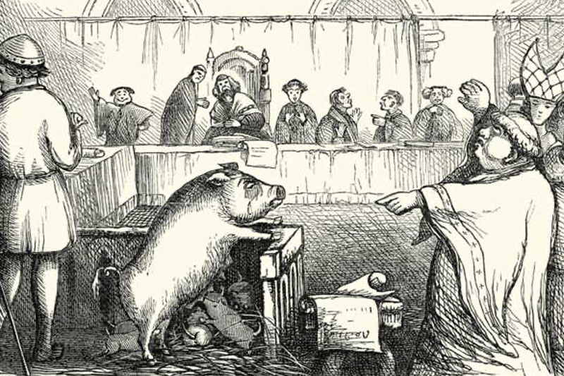 15 mars 1403, une truie est jugée puis condamnée à mort à Meulan, près de Paris, pour avoir dévoré un enfant. Elle passe d'abord par la prison, puis le bourreau — spécialement venu de Paris — la conduit à la potence. Les comptes de l'époque détaillent minutieusement les frais : 6 sols parisis (monnaie locale) pour sa « pension » en geôle, 54 sols pour le bourreau parisien, 6 sols pour la charrette qui l'amena au gibet, 2 sols pour les cordes, et 2 deniers pour des gants neufs au bourreau ! Ces gants devaient garantir que ses mains « sortissent pures » de l'exécution d'une bête. La truie fut finalement pendue selon la même procédure qu'un criminel humain !