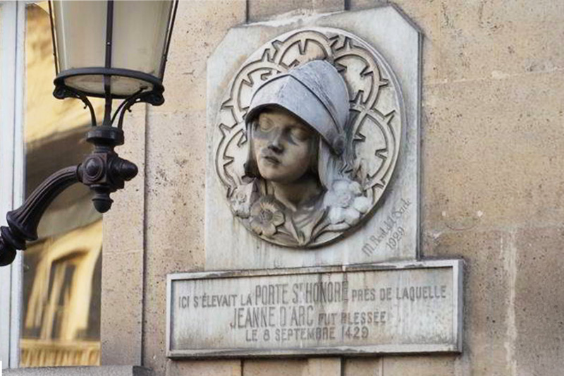 Le 8 septembre 1429, Jeanne d'Arc tente de prendre Paris aux Anglais en attaquant la porte Saint-Honoré. Alors qu'elle tente de franchir les fossés, un arbalétrier la reconnaît et, l'insultant copieusement, lui décoche un carreau d'arbalète dans la cuisse. Au même moment, son porte-étendard reçoit un carreau au pied. Relevant sa visière pour examiner sa blessure et retirer le dard, il en reçoit un deuxième entre les yeux et s'effondre. L'étendard gît dans la poussière. Bien que blessée, Jeanne souhaite reprendre l'attaque le lendemain. Mais le roi Charles VII, qui n'a jamais vraiment voulu prendre Paris, ordonne la retraite et fait même détruire le pont construit pour poursuivre l'assaut. C'est un échec cuisant : Paris ne sera reprise qu'en 1436.