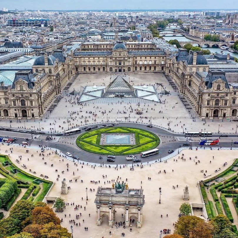 Question : Depuis la cour carrée du Louvre, se déploient deux immenses ailes de part et d'autre de la Pyramide....