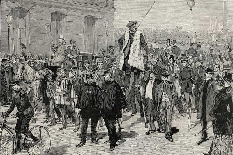 Le 9 septembre 1889, en pleine Exposition universelle, un boulanger landais décida d'accomplir un exploit totalement déjanté sur la Tour Eiffel ! Sylvain Dornon grimpa sur des échasses les 347 marches qui mènent au premier étage — performance qui lui prit plusieurs heures sous les yeux ébahis des spectateurs. Ce n'était pas son coup d'essai : cet échassier professionnel avait déjà marché de Paris jusqu'à Moscou sur échasses en 58 jours ! Mais la Tour offrait un défi vertical inédit. L'événement fit sensation dans la presse de l'époque et marqua le début d'une longue série d'exploits sur le monument : parachutistes, funambules, cyclistes... La "Dame de fer" devint rapidement le terrain de jeu favori des cascadeurs et originaux en tout genre !